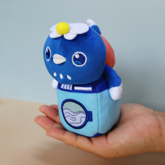 このぬいぐるみは、コインランドリーの洗濯乾燥機の上で、洗濯物が終わるのを待っているるりらんが魅力的。デスクやリビングに飾るだけで、ほっこりした癒し空間を演出します。チェーンも付いているので、るりらんと一緒にお出かけも♪